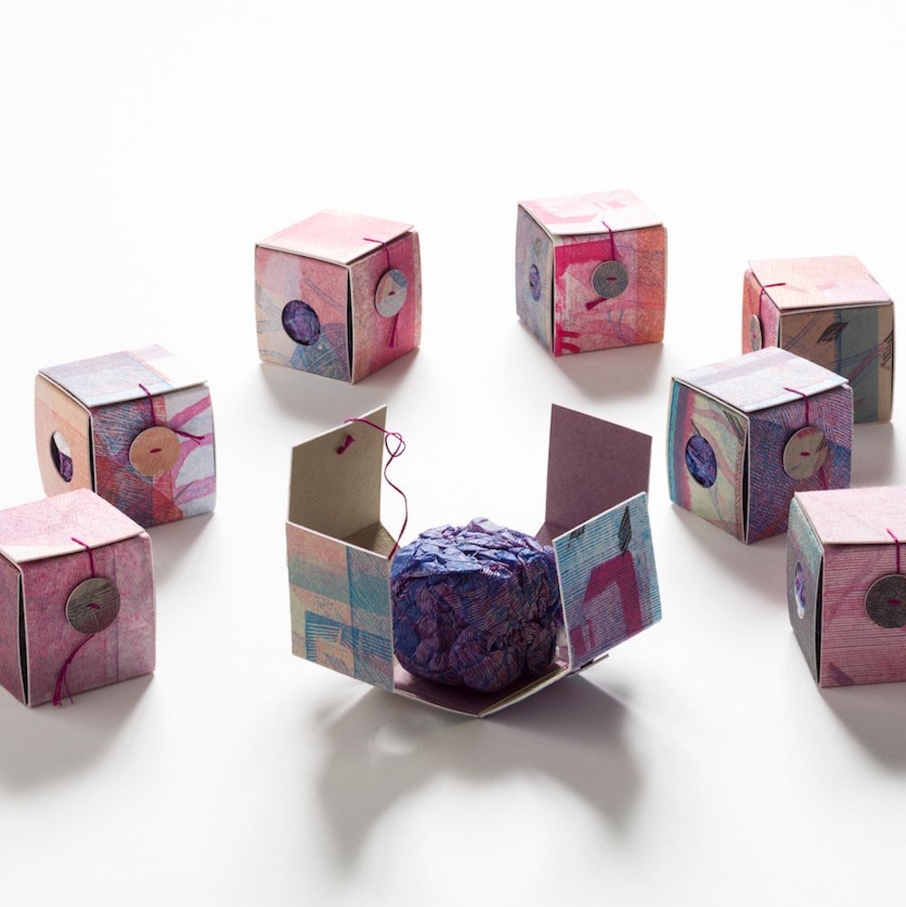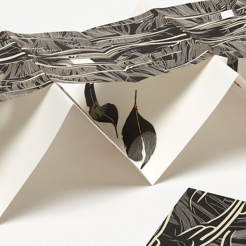 The artist books are either sculptural or traditional codex forms, with handmade enclosures. These have the double use of protecting the book, as well as adding to the experience by gradually revealing the artwork within.