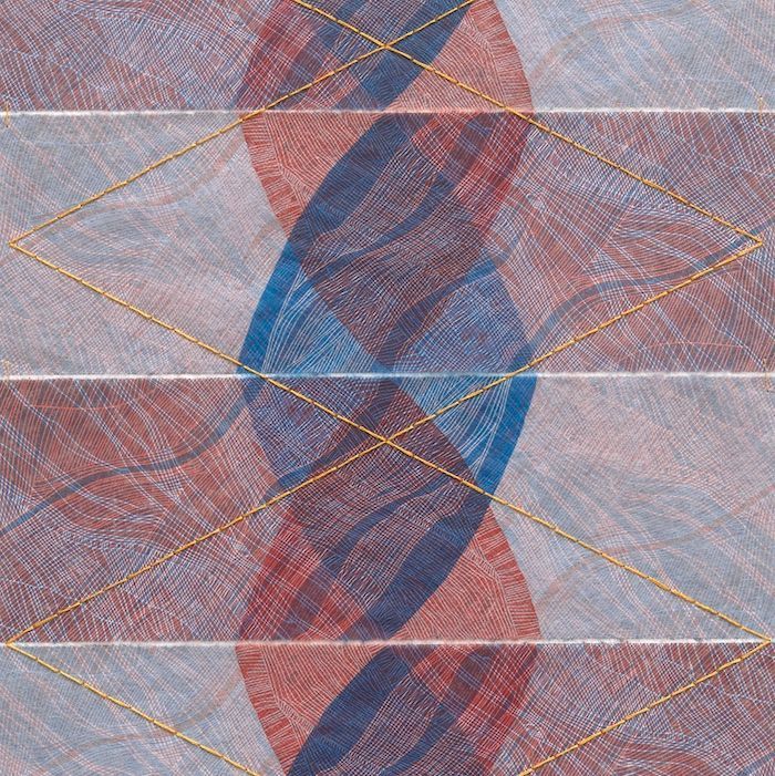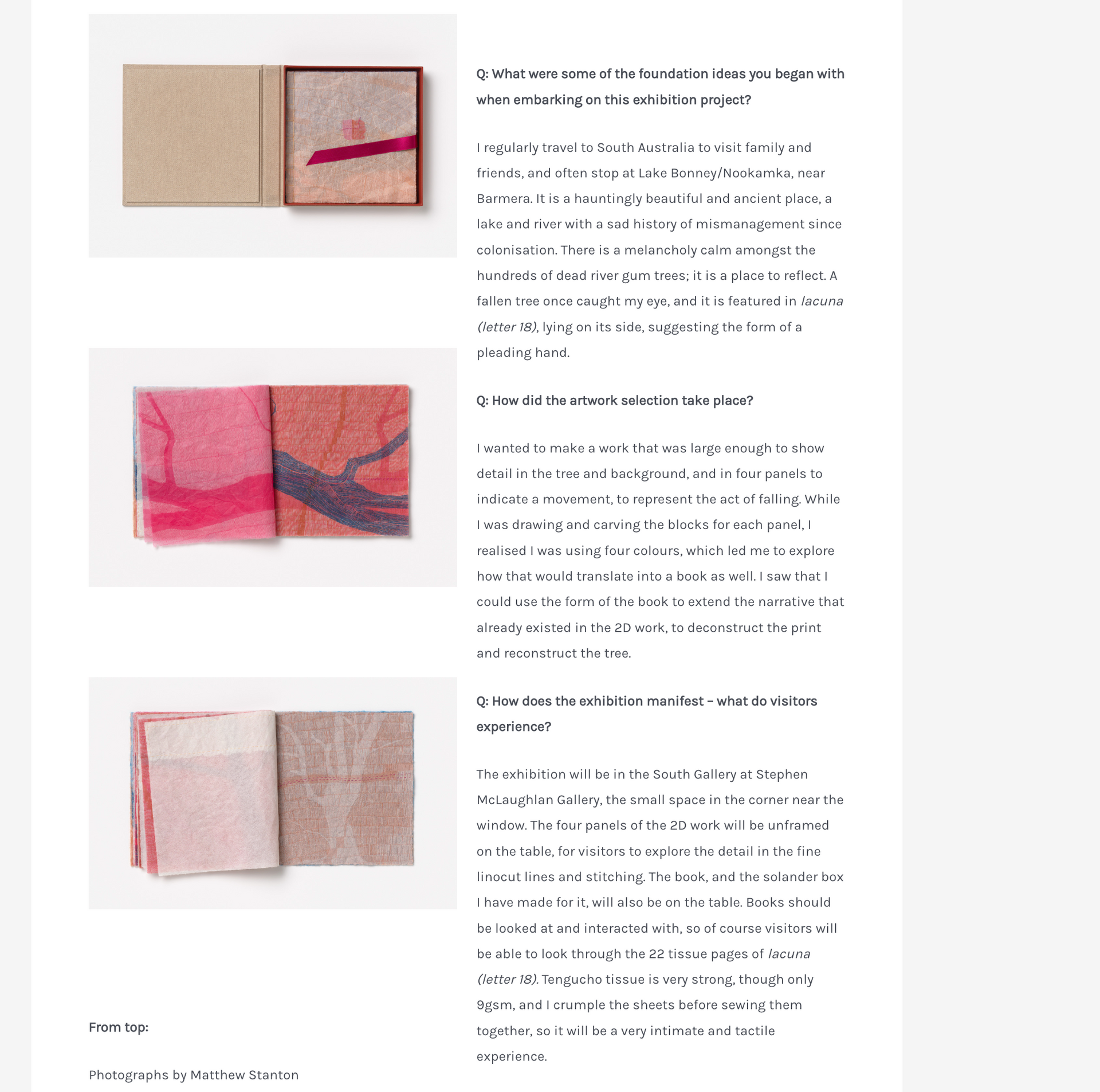 In my current art practice I make fine line linocuts and artist books, predominantly using Japanese papers. I often use more than one sheet of tissue paper, stitching them together with embroidery thread to intensify the colours and layers of fine lines.